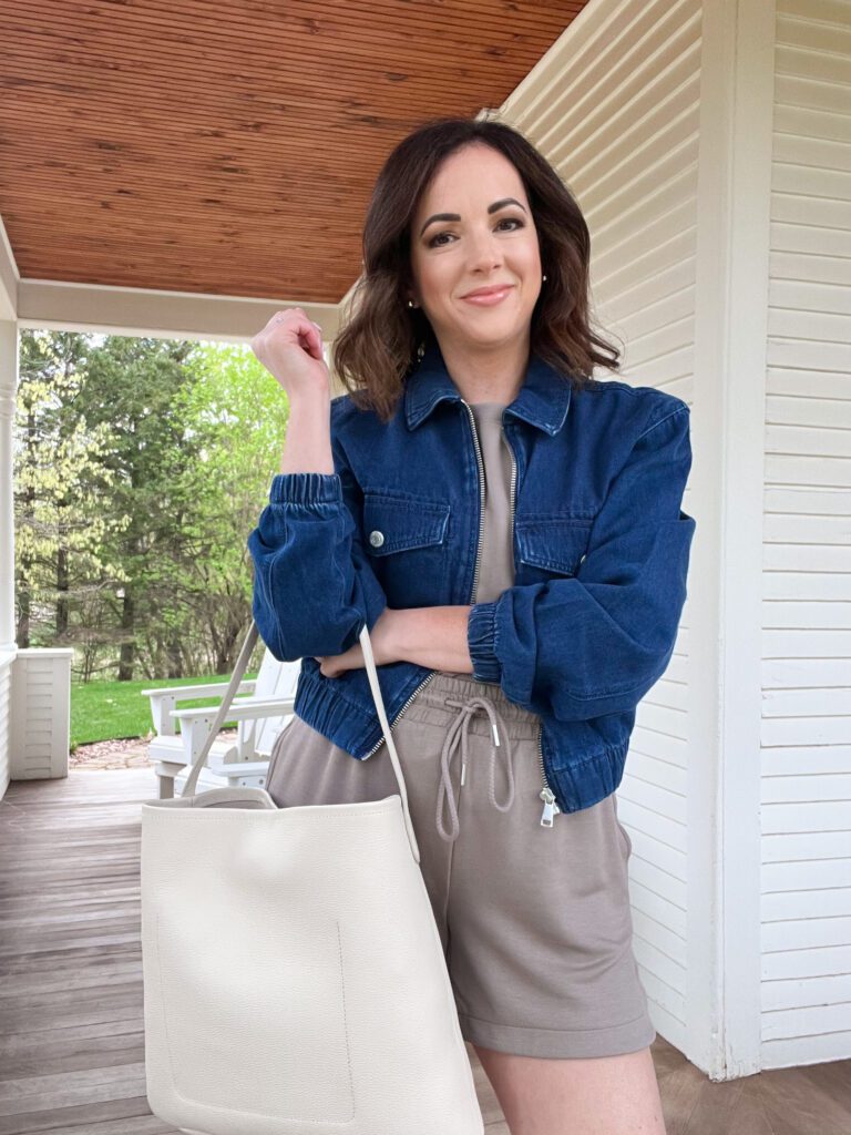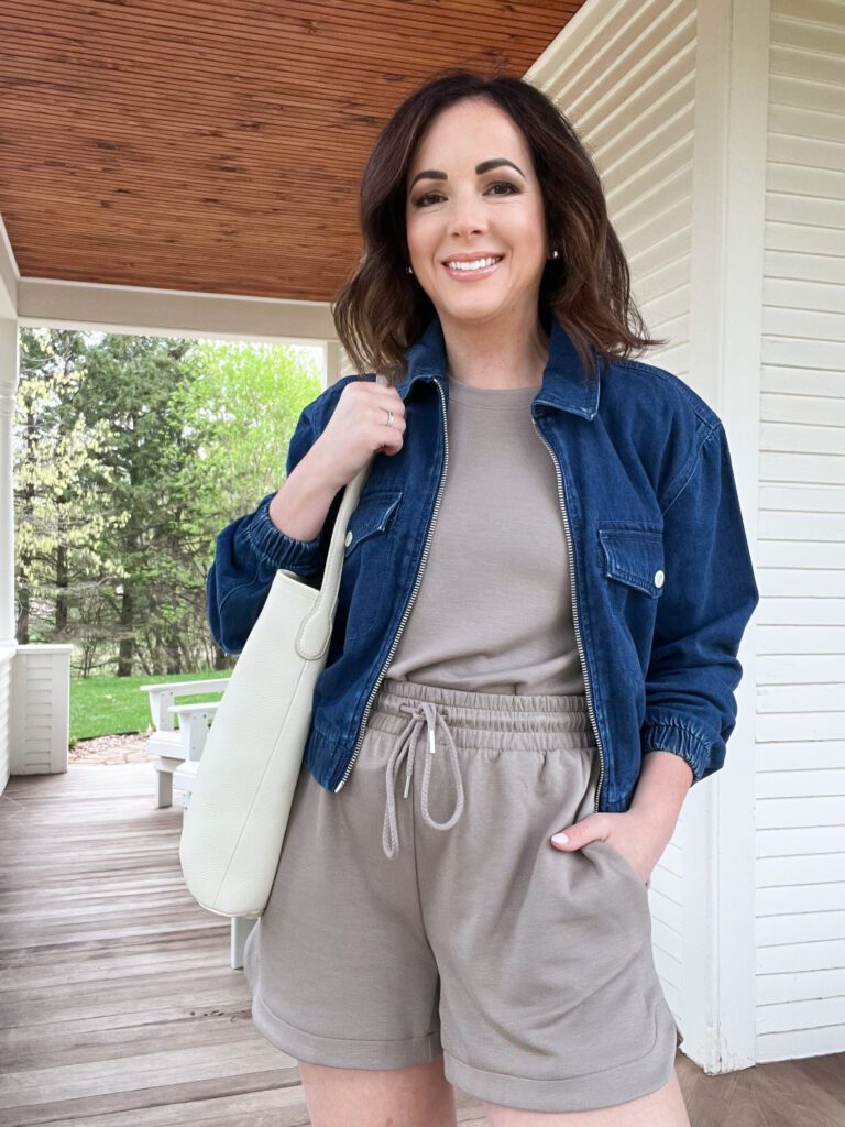 (Outfit Details: Denim Jacket – similar, top, shorts, tote – similar, same tote in cognac)